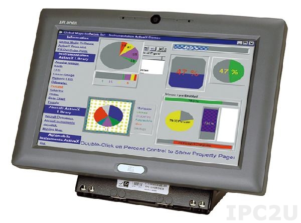 Безвентиляторная панельная рабочая станция с 10.2" 400кд/м2 WSVGA, резистивный сенсорный экран, Intel Atom N270 1.6ГГц, Intel 945GSE+ICH7M, 1Гб DDR2, 1x внешний SATA, CF, 2xCOM, 2xUSB, 2xRJ45, WLAN, Аудио, камера 2MP, микрофон, питание 12В DC 28Вт