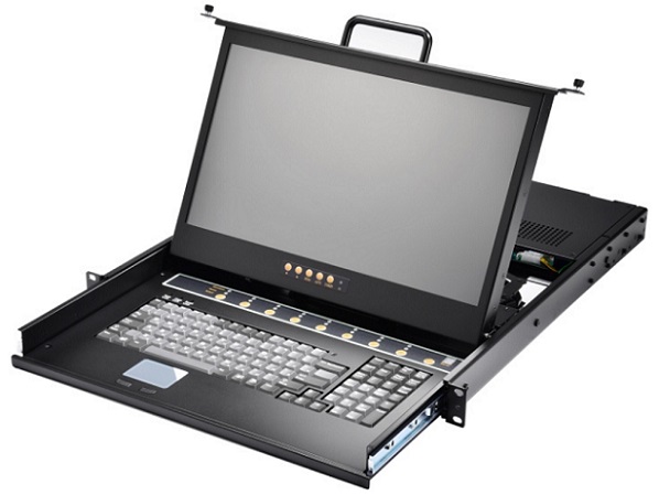 1U консоль для 19" стойки 17.3" TFT LCD монитор, 1920x1080, клавиатура, комплект 8 кабелей 1.8м DVI/USB KVM, 8 портов DVI KVM, Touchpad, одиночные направляющие, стальной корпус