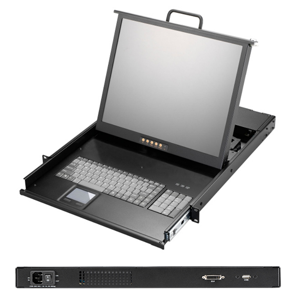 1U консоль для 19" стойки 19" TFT LCD монитор, клавиатура, 1.8м кабель USB DVI-D/KB/Mouse, 1 порт USB KVM, Touchpad, одиночные направляющие, стальной корпус