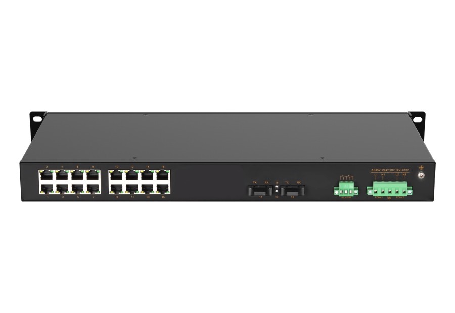 Неуправляемый коммутатор в 19" стойку, 2 порта 100M Fx, 16 портов 10/100M Tx, Multi-mode, ST разъем, 2км, вход питания 85-264VAC/110-370VDC, IP40, -40...+75C