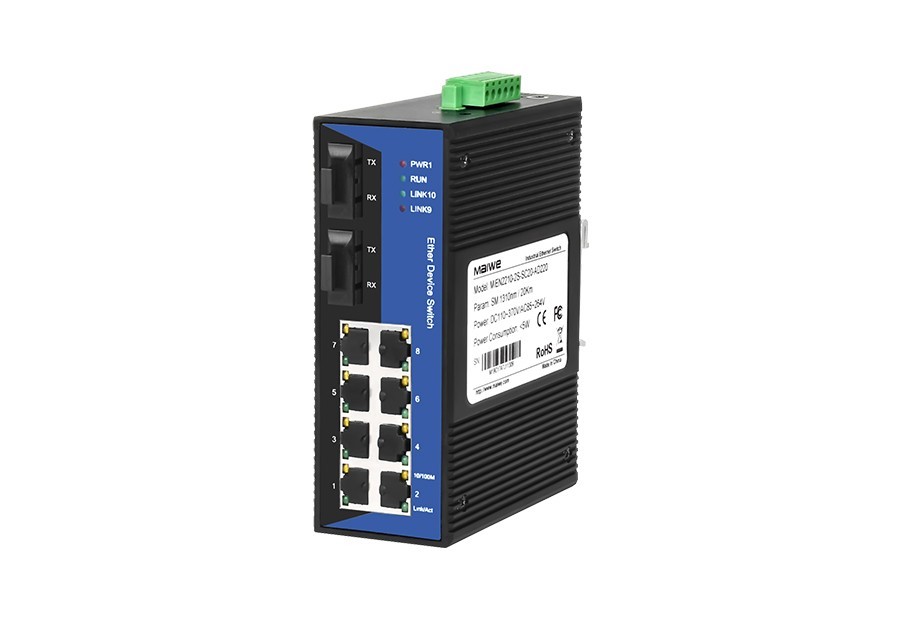 Компактный неуправляемый коммутатор Layer 2 на Din-рейку, 2 x 100M Fx, 8 x 10/100M Tx, AC85-264V/DC110-370V, Single-mode, FC разъем, 60км, IP40, -40...+85C