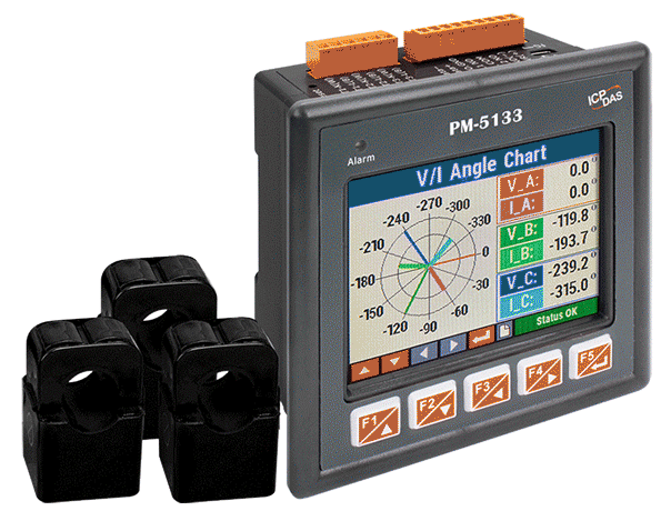 3-фазный компактный измеритель напряжения и тока, сенсорный экран 3.5" 240x320 LCD, кабель 10мм, 10-500V, 0.05-5A, 50/60Гц, 2 выхода реле 5A@250VAC/5A@30VDC, Modbus RTU, в комплекте с тремя токовыми преобразователями, 12-48VDC-in