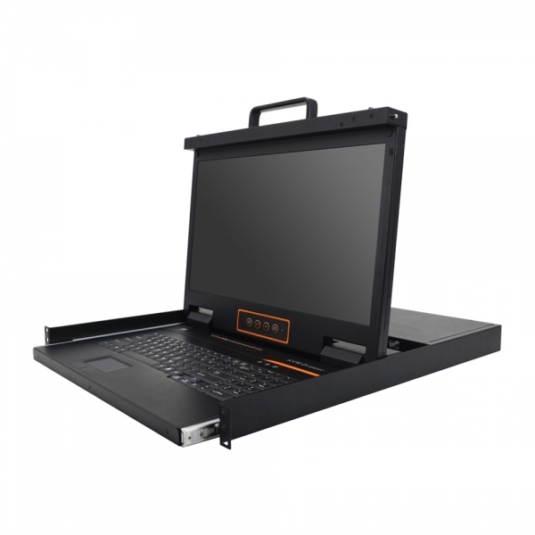 1U консоль для 19" стойки 18.5" TFT Full HD LCD монитор, клавиатура 99 клавиш, 8xKVM VGA порта, тачпад, 100-240В AC